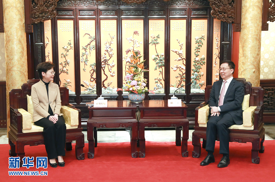 3月6日,中共中央政治局常委、國務(wù)院副總理韓正在北京釣魚臺國賓館會見香港特別行政區(qū)行政長官林鄭月娥。新華社記者 龐興雷 攝