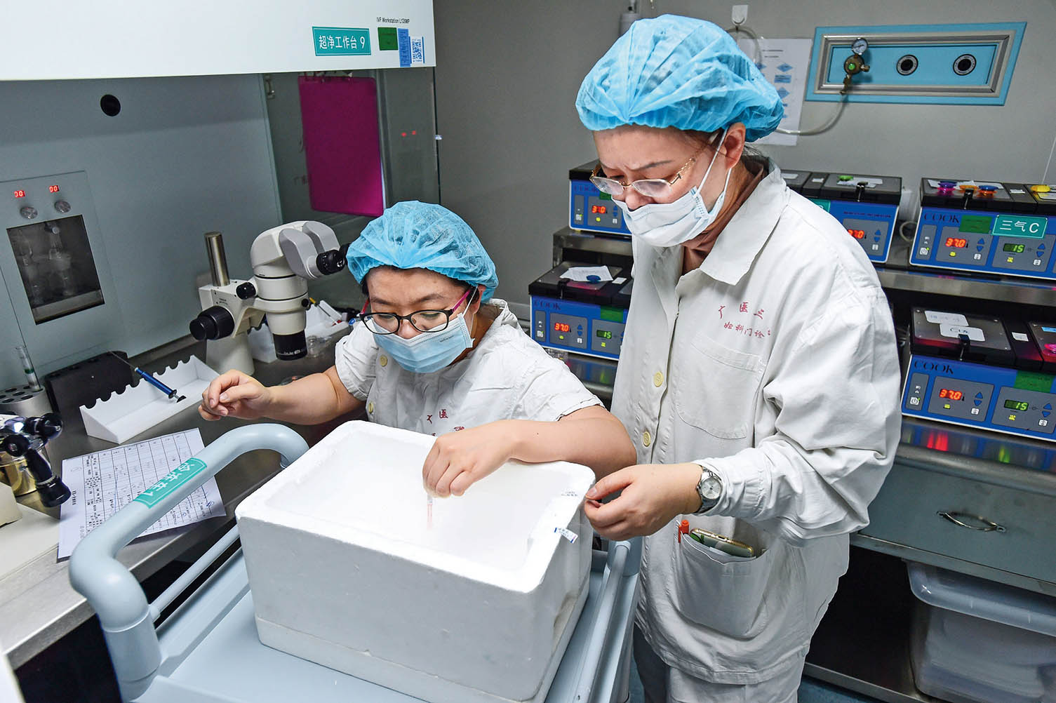 2017 年 3 月 20 日,广州医科大学附属第三医院胚胎实验室人员杜红姿(右)和陈仕萍核对从冷冻库里提取的胚胎