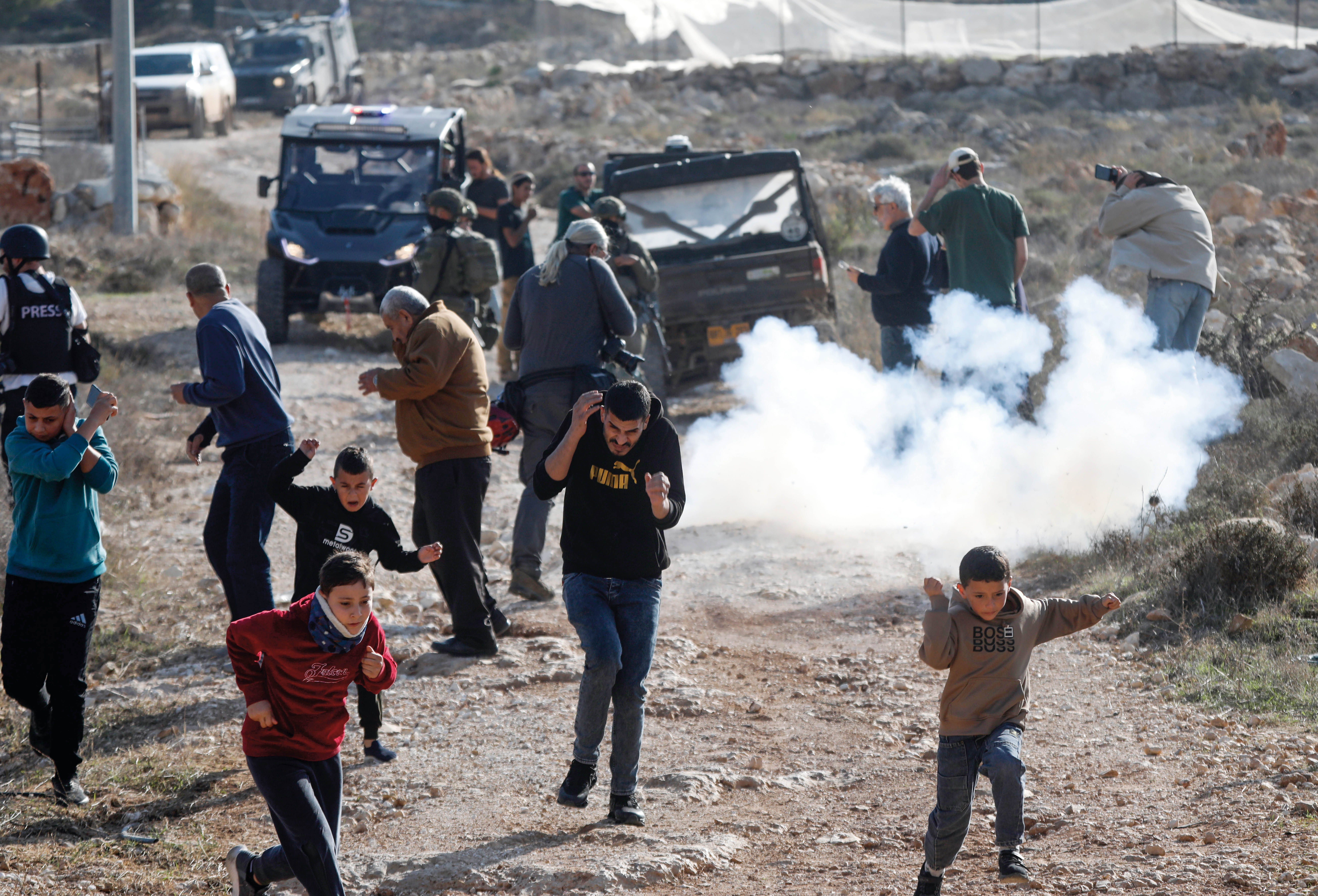 2025 年 11 月 28 日,在约旦河西岸城市希伯伦以西的泰尔古米耶,巴勒斯坦人躲避以军发射的催泪弹
