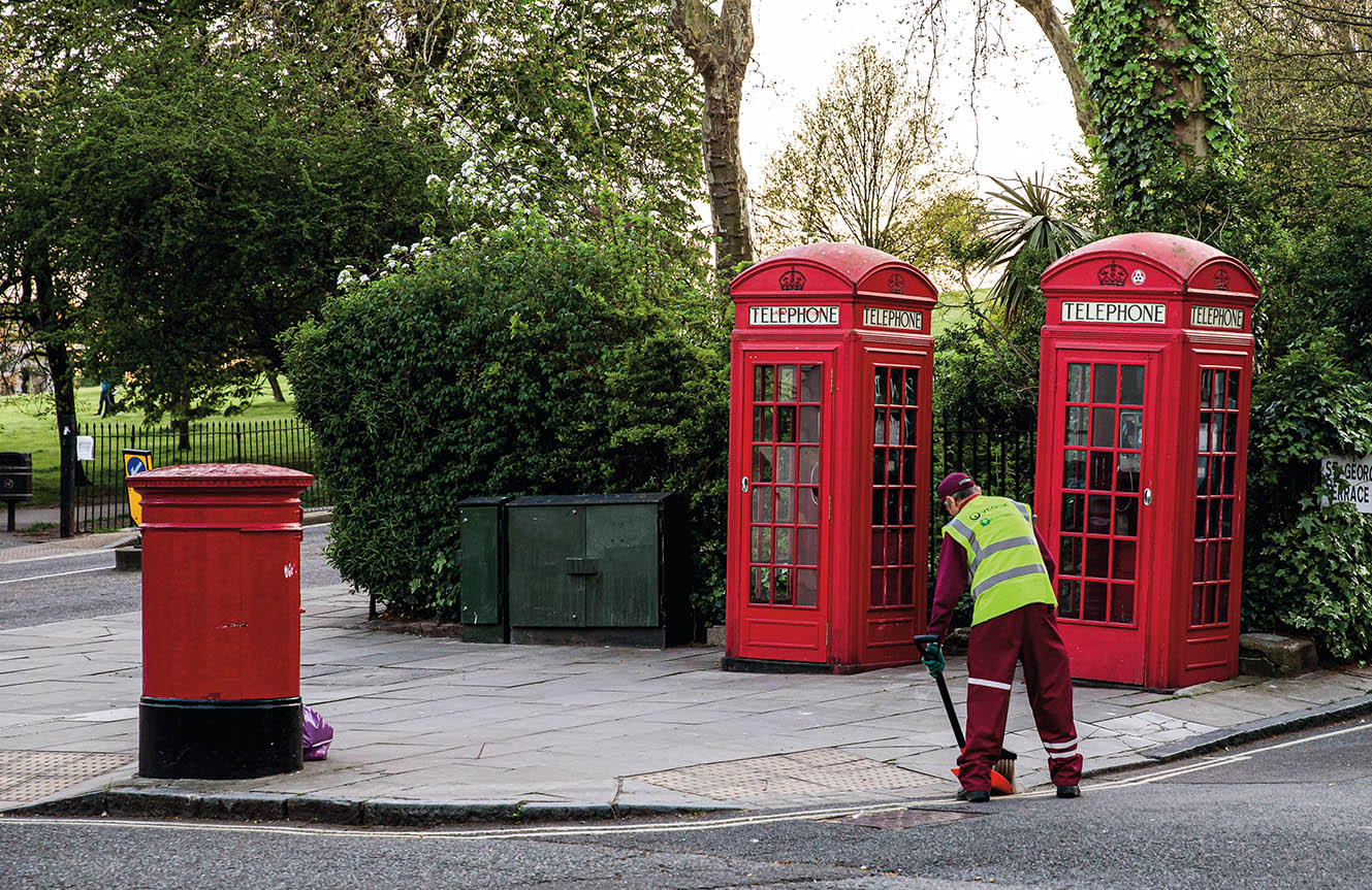 2020年4月11日,在英国伦敦,一名清洁工人在红色电话亭和邮筒旁清扫路面