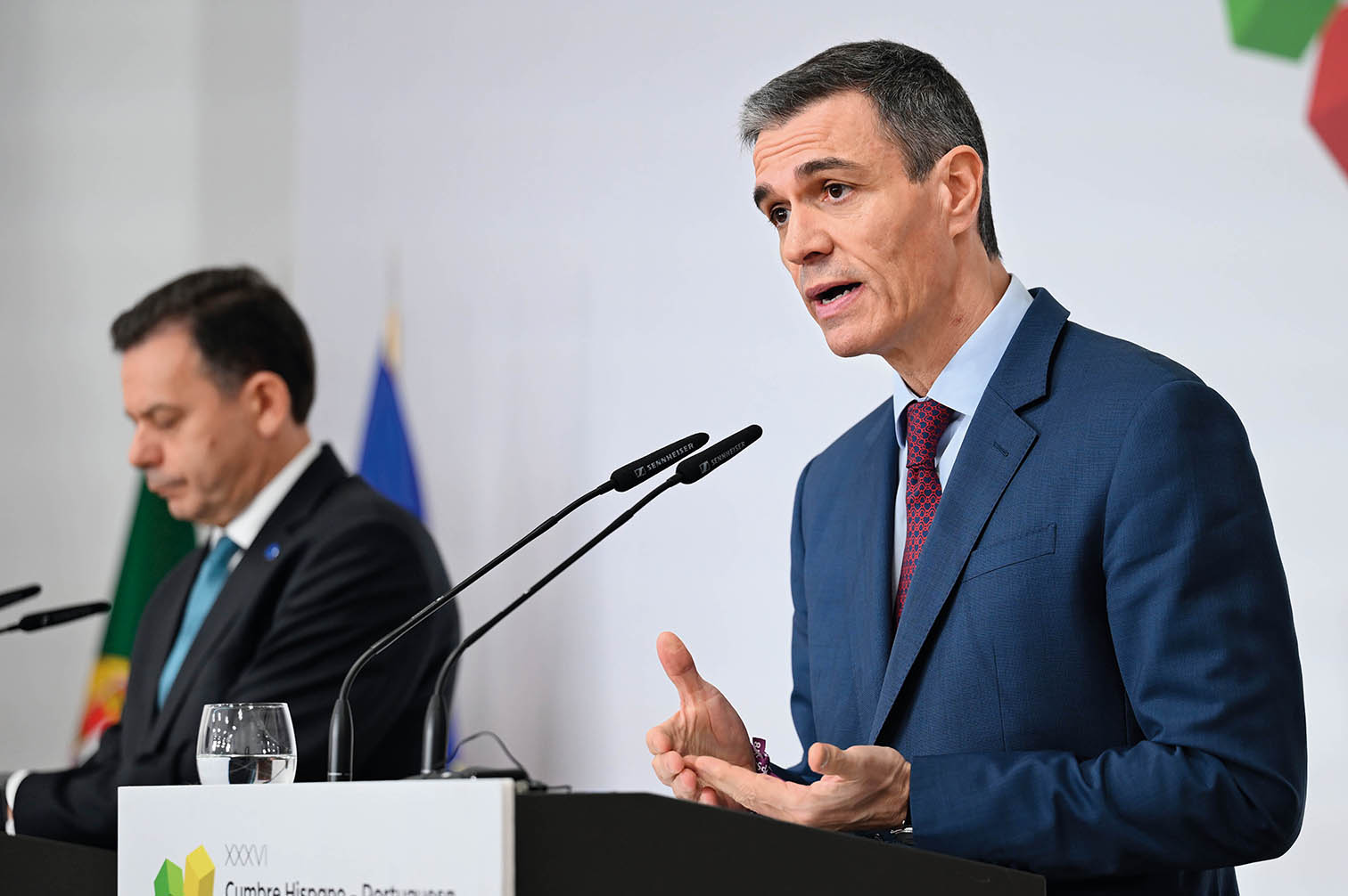 2026年3月6日,在西班牙韦尔瓦省拉拉比达,西班牙首相佩德罗·桑切斯(右)在西班牙-葡萄牙峰会新闻发布会上讲话