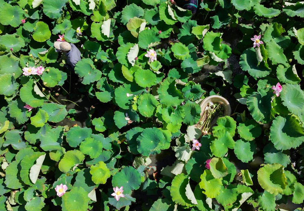 7月23日,种植户在海宁市海昌街道双山村的“武莲海种”荷花基地采收荷花和莲蓬(无人机照片)。