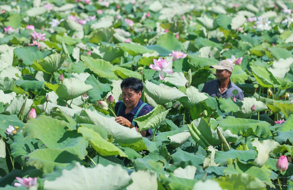 7月23日,种植户在海宁市海昌街道双山村的“武莲海种”荷花基地采收荷花和莲蓬。