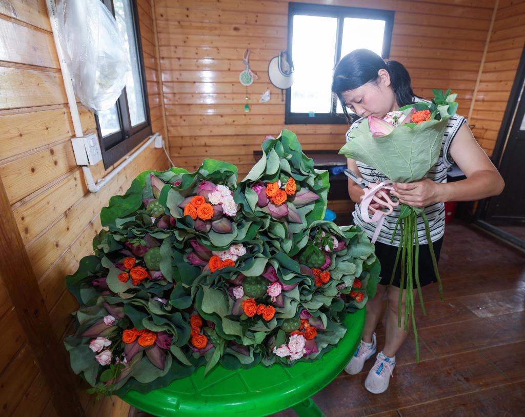 7月23日,工作人员在海宁市海昌街道双山村的“武莲海种”荷花基地用荷花、莲蓬荷叶等制作花束。