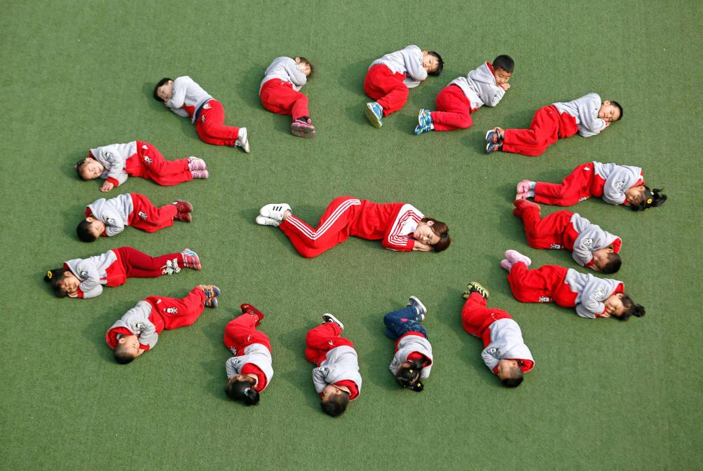 一家幼儿园的老师和小朋友们在做睡眠游戏