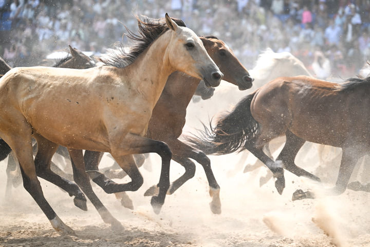 在内蒙古自治区第二届蒙古马超级联赛开幕式上拍摄的蒙古马群(2025年7月11日)。新华社记者 贝赫 摄