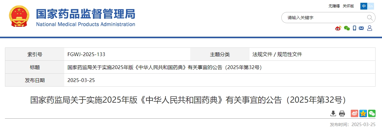 3月25日,国家药监局发布公告,2025年版《中华人民共和国药典》(以下简称《中国药典》)经第十二届药典委员会执行委员会审议通过,自2025年10月1日起施行。