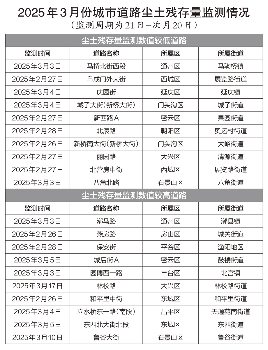 推进道路尘土残存量治理能有效防止扬尘二次污染,提高城市洁净指数,是打好空气污染攻坚战的关键战场之一。2025年一季度,北京市城市管理委员会对749条次道路、3745个采样点进行了尘土残存量检测,结果显示,尘土残存量数值均值控制在标准以内并呈现稳中有降趋势。