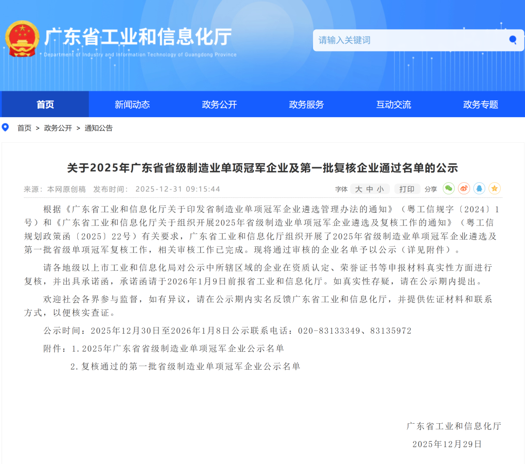 近日,广东省工业和信息化厅正式公示了《2025年省级制造业单项冠军企业公示名单》。经过严格遴选与评审,广东省光电技术协会多家会员单位凭借其长期专注细分领域、卓越的技术创新能力和领先的市场地位,成功入选该重量级榜单。这不仅是企业自身实力的彰显,更是广东光电产业高质量发展、核心竞争力不断提升的生动体现。以下为各获奖企业的风采展示: