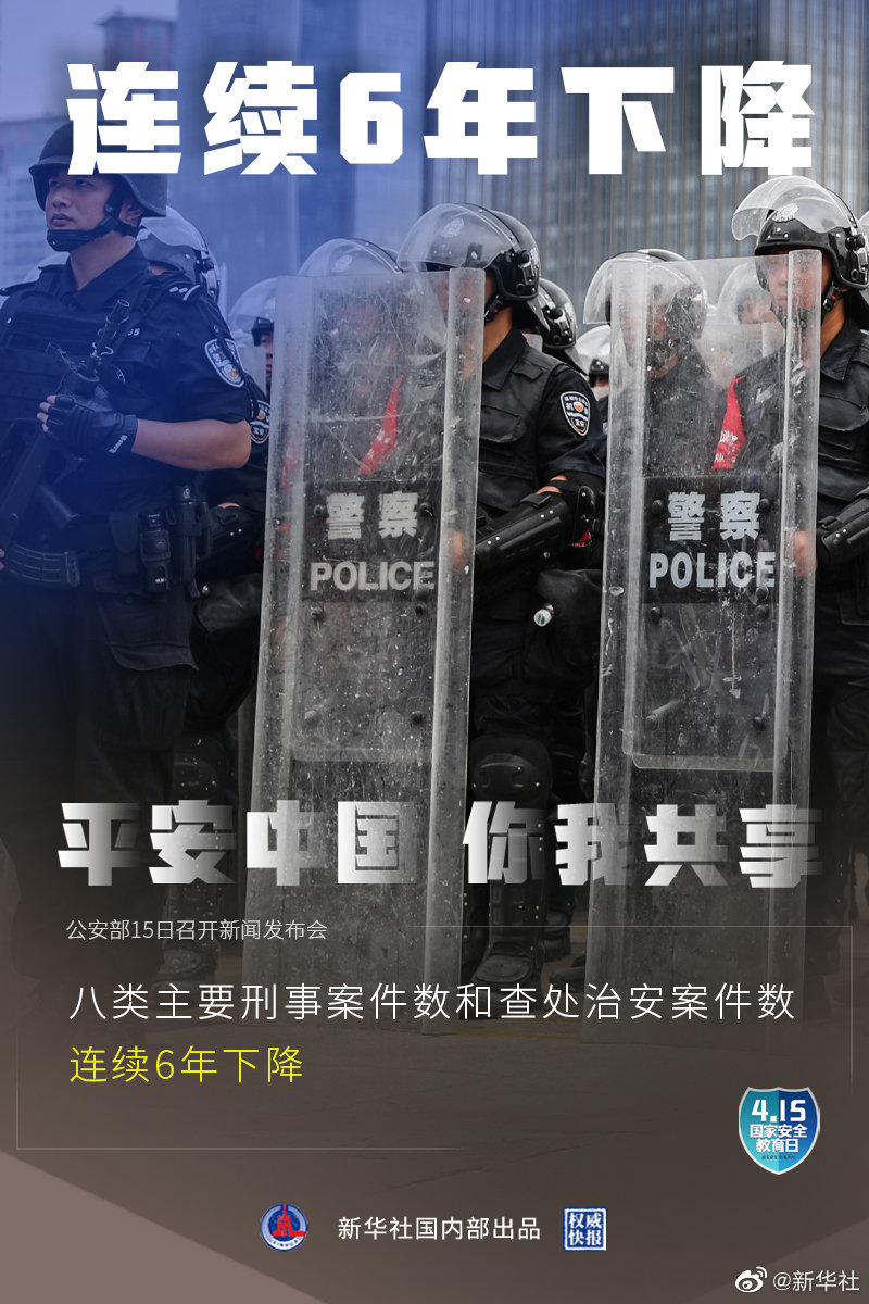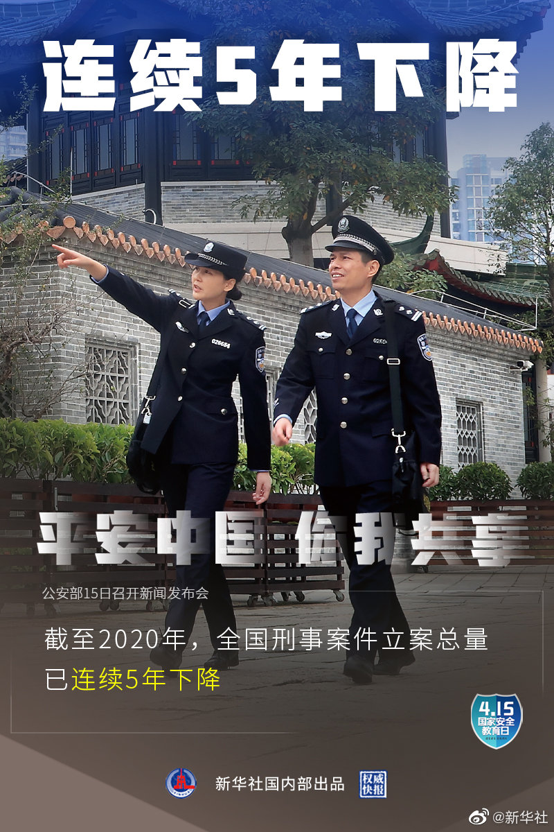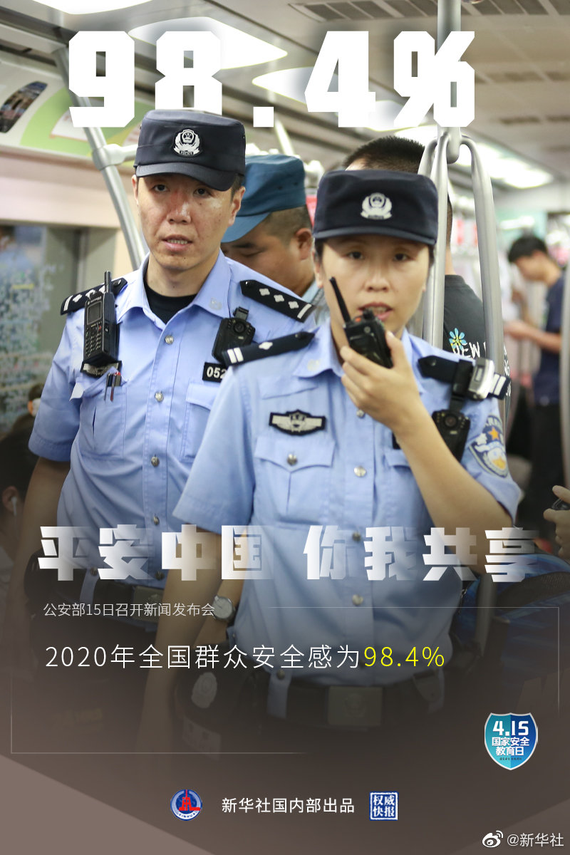 4月15日是第六個全民國家安全教育日,公安部15日召開新聞發(fā)布會介紹:2020年全國群眾安全感為98.4%,全國居民對社會治安滿意度達(dá)83.6%。截至2020年,全國刑事案件立案總量連續(xù)5年下降,八類主要刑事案件數(shù)和查處治安案件數(shù)連續(xù)6年下降。(記者熊豐,海報設(shè)計張晨光)