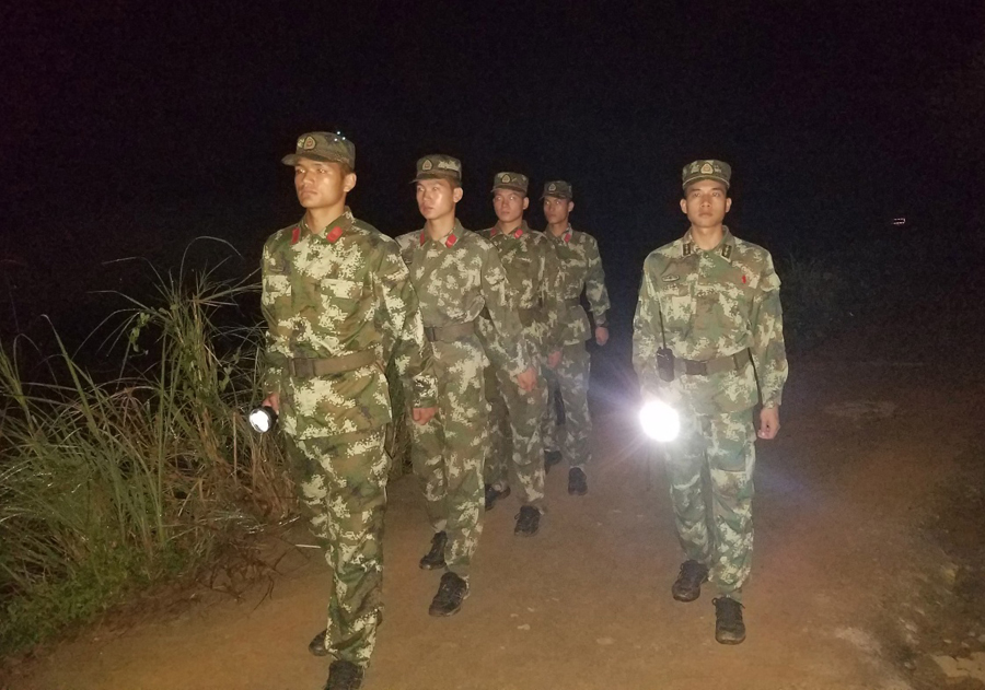 ????7月31日,在廣西梧州市蒼梧縣沙頭鎮(zhèn)參田村,武警梧州市支隊(duì)官兵在村里巡邏排查受災(zāi)情況(手機(jī)拍攝)。