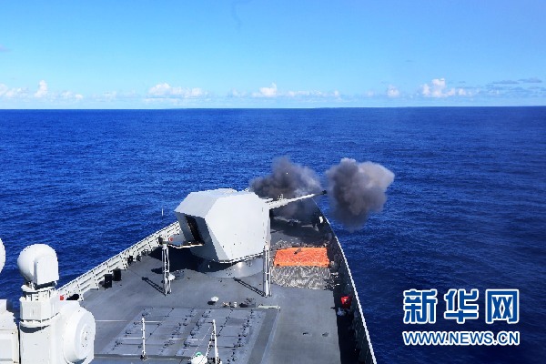 2月19日,在海上現(xiàn)場反擊演練中,長沙艦對“敵艦”進(jìn)行主炮火力射擊。