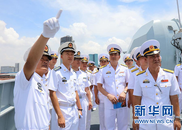 當(dāng)?shù)貢r(shí)間上午10時(shí),編隊(duì)導(dǎo)彈驅(qū)逐艦長(zhǎng)春艦、導(dǎo)彈護(hù)衛(wèi)艦荊州艦緩緩靠上胡志明市西貢港碼頭。越南海軍為編隊(duì)到訪舉行了歡迎儀式。儀式結(jié)束后,部分越南海軍官兵、使領(lǐng)館工作人員、中資機(jī)構(gòu)、留學(xué)生及華人華僑代表參觀了長(zhǎng)春艦。