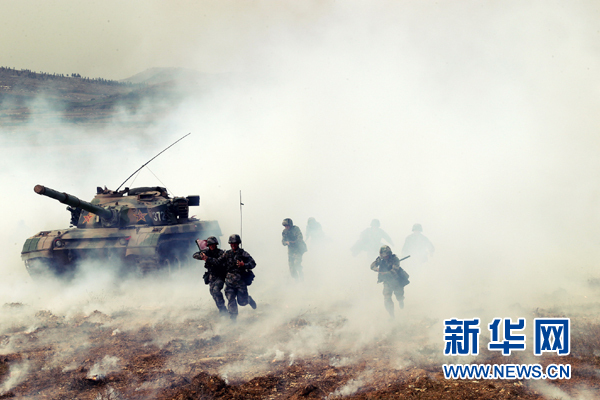 在一次實(shí)兵演習(xí)中,“王杰班”所在連隊(duì)官兵配合坦克突入“敵”一線陣地(2014年10月16日攝)。新華社發(fā)(王磊 攝)