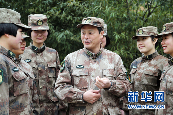 徐洪剛(中)與某紅軍師戰(zhàn)士談心交流(2月20日攝)。新華社發(fā)