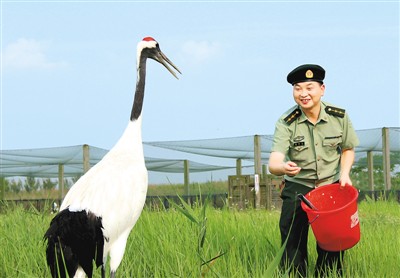 ????駐守在這里的邊防官兵主動承擔(dān)起守護濕地生態(tài)、保護野生動物的使命,他們?nèi)找勾┧笱策壴趶V袤的濕地。僅今年以來,該所依托“警民義務(wù)護鳥隊”、“護鳥熱線”等平臺,組織官兵巡邏踏查保護區(qū)核心區(qū)域120余次,定期向丹頂鶴等各類候鳥投放玉米等飼料。同時,該所深入轄區(qū)向村民宣傳《野生動物保護法》,讓這片土地真正成為候鳥的一片樂土,獲得了保護區(qū)、駐地政府以及當?shù)匕傩盏馁澴u,邊防官兵們被親切地稱作候鳥“守護神”。圖為官兵喂食丹頂鶴。(童瑞金 耿建平)