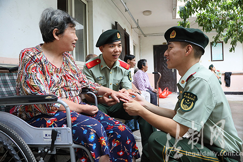 ????8月29日下午,江蘇邊防總隊(duì)連云港邊檢站面臨復(fù)退的戰(zhàn)士最后一次穿著軍裝走進(jìn)駐地敬老院,看望他們“認(rèn)親”的老人,送上他們退伍前的一聲祝福,并將“認(rèn)親”的老人交到留隊(duì)的戰(zhàn)友手中,將這份愛心傳遞下去。據(jù)悉,這個站“認(rèn)親”的傳統(tǒng)已經(jīng)延續(xù)了27年,每名官兵都有“認(rèn)親”的孤寡老人,他們和老人之間建立了深厚的感情。(錢逸帆 王鈺)