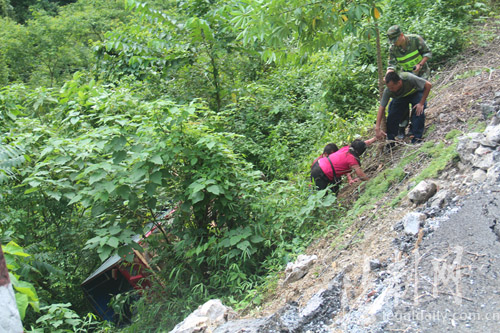 ????獲悉情況后,該所立即向百南鄉(xiāng)衛(wèi)生院通報情況,并組織官兵趕赴現(xiàn)場施救。邊防官兵在現(xiàn)場發(fā)現(xiàn)一輛三輪車側(cè)翻在半山坡,山坡下是10多米深的河流?!昂迷谟袠鋽r住,要不然后果不敢想象?!眹^群眾李師傅說道。