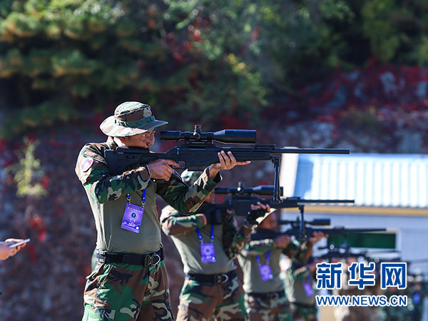 10月18日,參賽隊員在多種姿勢狙擊課目中采用立姿進行狙擊。新華社發(fā)(安曉惠 攝)