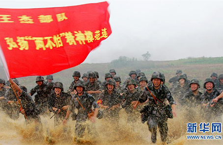 ????在一次對抗演習中,“王杰班”所在連隊官兵發(fā)起沖鋒(2015年6月25攝)。新華社發(fā)(趙聰 攝)