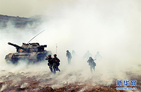 ????在一次實兵演習中,“王杰班”所在連隊官兵配合坦克突入“敵”一線陣地(2014年10月16日攝)。新華社發(fā)(王磊 攝)