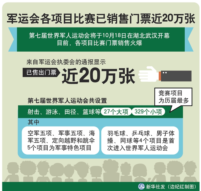 新華社武漢10月16日電(記者梁建強(qiáng))第七屆世界軍人運(yùn)動(dòng)會(huì)將于18日在湖北武漢開幕。目前,各項(xiàng)目比賽門票銷售火爆。來自軍運(yùn)會(huì)執(zhí)委會(huì)的通報(bào)顯示,已售出門票近20萬張。
