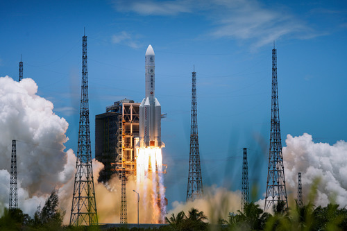 ????我國在海南島東北海岸中國文昌航天發(fā)射場,用長征五號(hào)遙四運(yùn)載火箭將我國首次火星探測任務(wù)“天問一號(hào)”探測器發(fā)射升空(7月23日)。新華社發(fā)(郭文彬 攝)