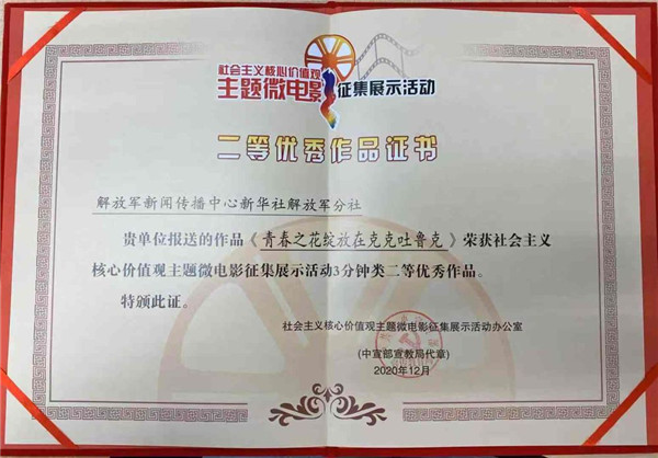 ????活動(dòng)自2020年5月開展以來,共收到社會(huì)各方面報(bào)送的作品4354部。征集工作結(jié)束后,由相關(guān)領(lǐng)域?qū)<覍W(xué)者組成的評審組對征集到的作品進(jìn)行評審,評選出優(yōu)秀作品134部、優(yōu)秀單項(xiàng)5個(gè)、優(yōu)秀組織單位12個(gè)。其中,由解放軍新聞傳播中心新華社解放軍分社申報(bào)的《青春之花綻放在克克吐魯克》獲“3分鐘類優(yōu)秀作品二等獎(jiǎng)”。