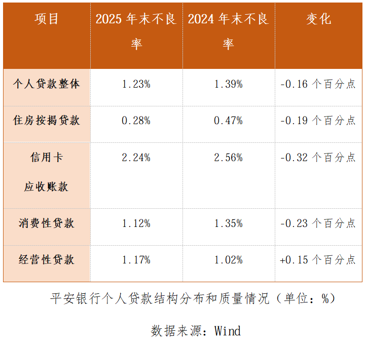其认为,重点风险领域来看,整体风险可控。2025年四季度平安银行房地产贷款不良率较三季度升至2.22%,全年同比上升0.43个百分点,风险暴露尚未见底,在同业中处中等水平。