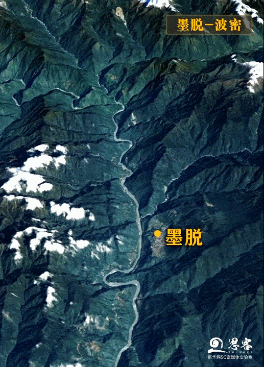 ▲從墨脫至波密縣扎木鎮(zhèn)衛(wèi)星三維實(shí)景。衛(wèi)星數(shù)據(jù)來源:高分六號