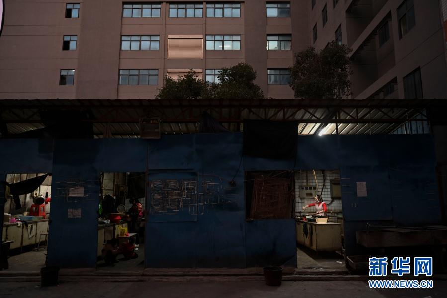 1月26日,在福建省石獅市的金利萊斯服裝廠,黃海龍的妻子黃愛(ài)華(右)在廚房做飯,其他工友也在一旁做飯。