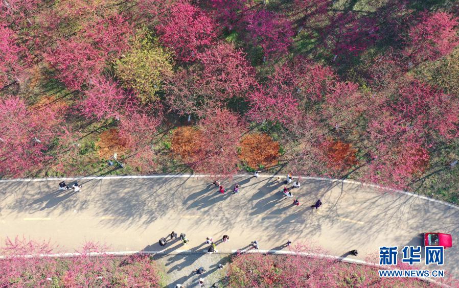 2月14日,游客在湖南省常寧市羅橋鎮(zhèn)櫻花園游玩 (無人機照片) 。新華社發(fā)(曹正平 攝)