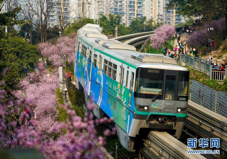 2月23日,在重慶軌道交通2號(hào)線佛圖關(guān)段,一列單軌列車穿越花海奔馳而過。
