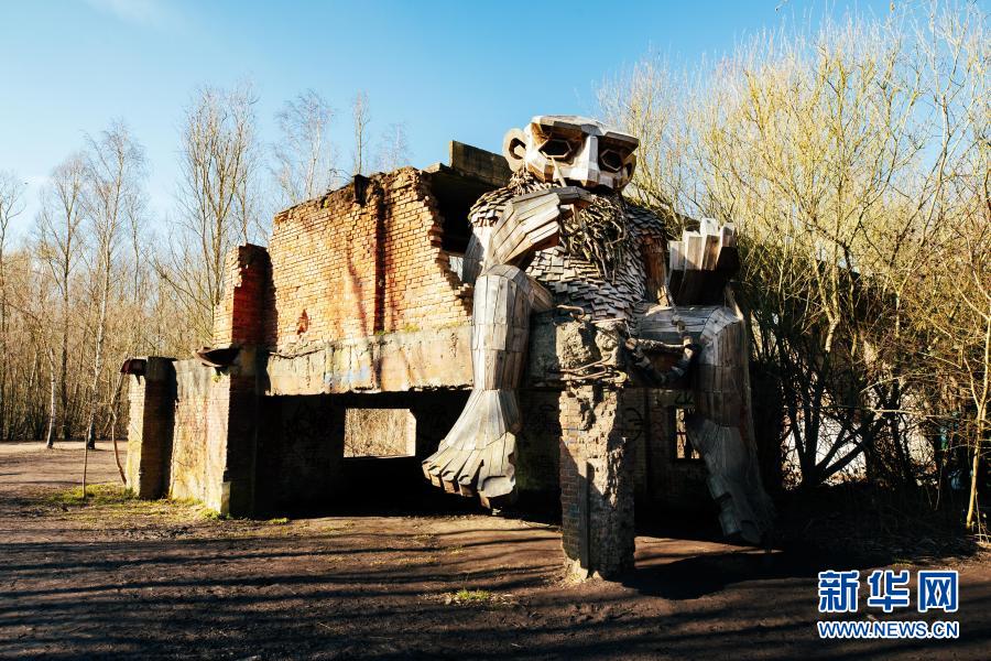 這是3月20日在比利時博姆市的德舒爾森林公園拍攝的一座“巨人”雕塑。新華社記者 張鋮 攝