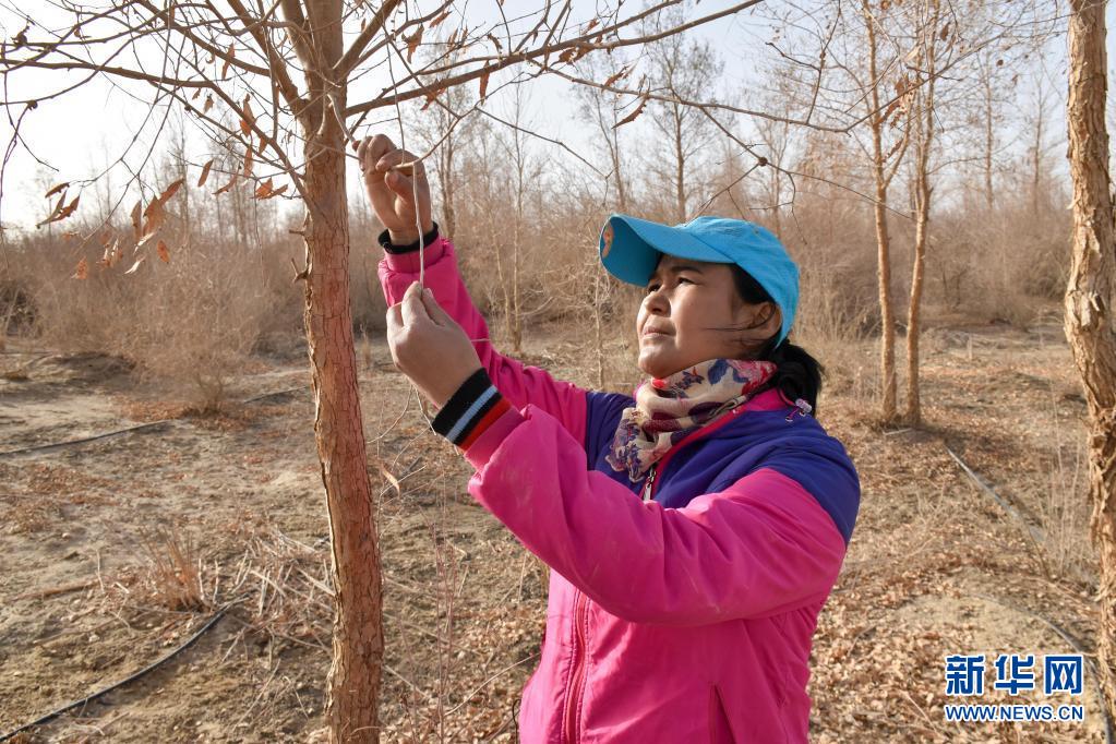 治沙員帕提古麗觀察梭梭林長(zhǎng)勢(shì)(4月1日攝)。新華社記者 高晗 攝