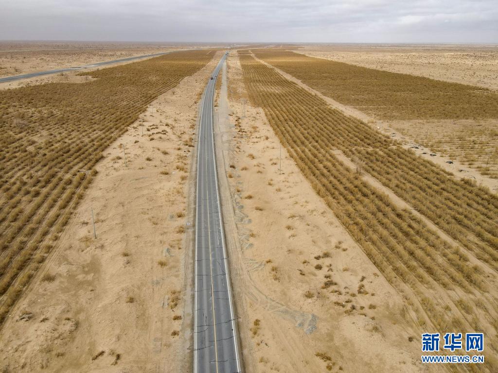 這是且末縣國(guó)道旁種植的生態(tài)梭梭林 (3月31日攝,無人機(jī)照片)。新華社記者 高晗 攝