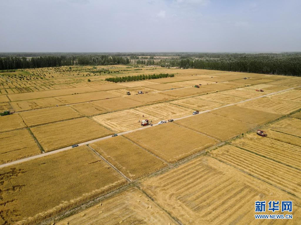 6月19日,空中俯瞰麥客阿地力·沙拉木工作的新疆庫車市齊滿鎮(zhèn)的麥收現(xiàn)場(無人機照片)。新華社記者 高晗 攝