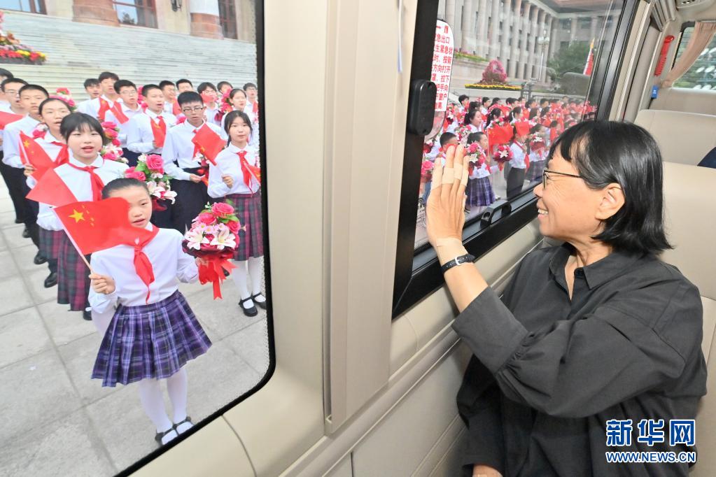 6月29日,慶祝中國共產(chǎn)黨成立100周年“七一勛章”頒授儀式在北京人民大會堂金色大廳隆重舉行。這是“七一勛章”獲得者張桂梅向青少年致意。新華社記者 岳月偉 攝