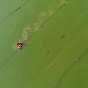 7月5日,在湖南省永州市道縣蚣?jí)捂?zhèn)洲背村,村民在收獲小龍蝦(無(wú)人機(jī)照片)。