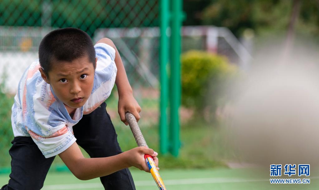 塔城市第二小學(xué)曲棍球隊(duì)的小隊(duì)員申世豪在訓(xùn)練中(6月11日攝)。