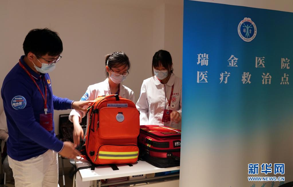 上海交通大學(xué)醫(yī)學(xué)院附屬瑞金醫(yī)院的醫(yī)護人員擔(dān)當(dāng)志愿者,在中共一大紀(jì)念館設(shè)立醫(yī)療救治點,提供醫(yī)療保障任務(wù)(7月11日攝)。