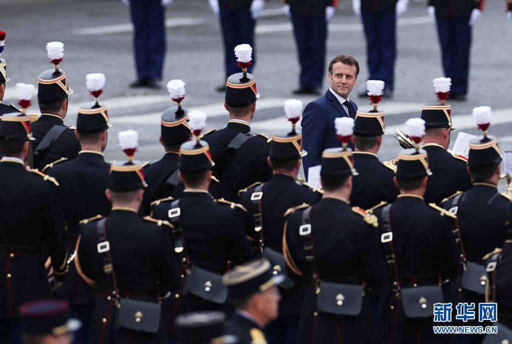 7月14日,法國總統(tǒng)馬克龍在巴黎協(xié)和廣場國慶閱兵式現(xiàn)場檢閱隊伍。