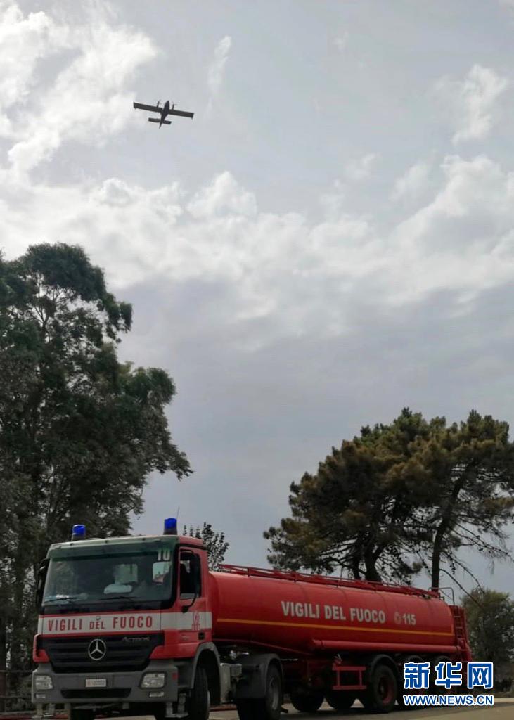7月26日,消防車在意大利撒丁島參與滅火作業(yè)(手機照片)。