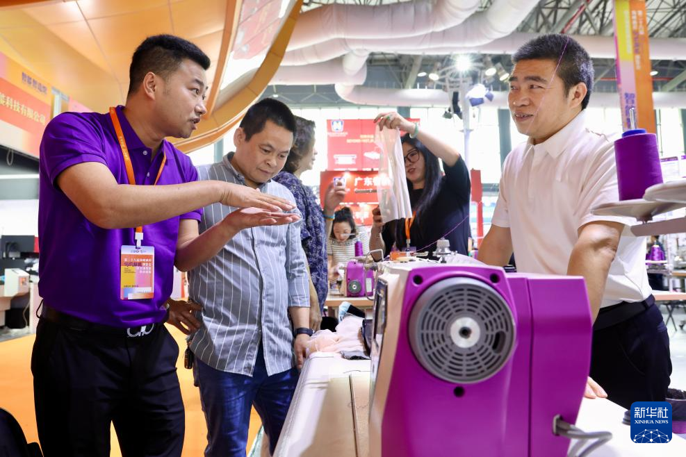 4月18日,参展商工作人员(左)在博览会上向参观者介绍缝纫机设备。