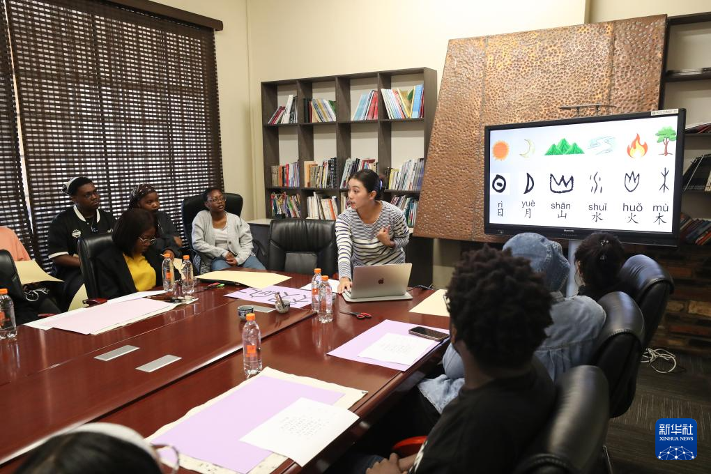 4月17日,在南非约翰内斯堡,约翰内斯堡大学孔子学院的教师在“国际中文日”文化交流活动上向当地学生介绍中国汉字。