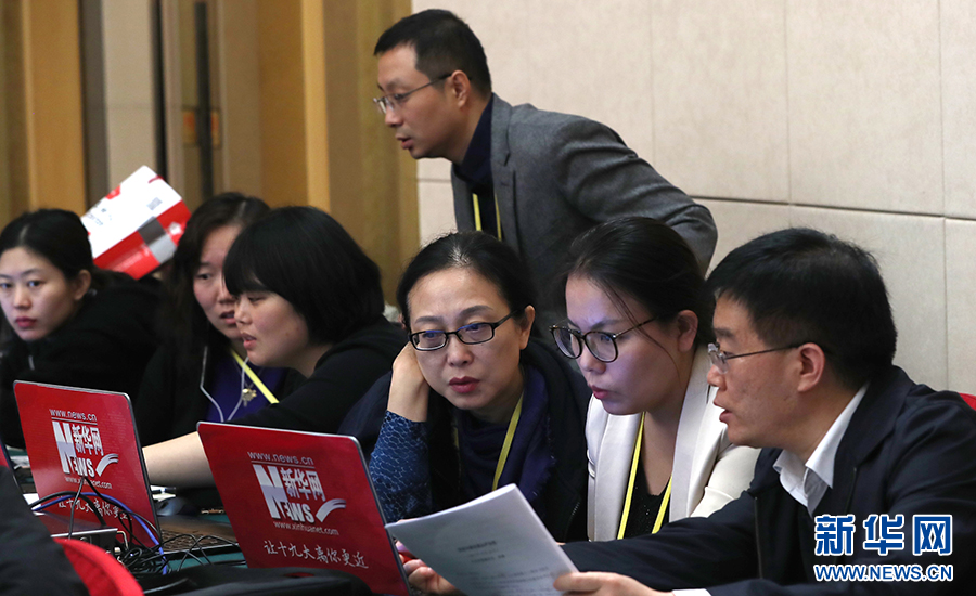 10月26日上午10:00,中國共產(chǎn)黨第十九次全國代表大會新聞發(fā)言人在梅地亞賓館二層新聞發(fā)布廳召開專題新聞發(fā)布會,請有關(guān)方面負(fù)責(zé)人解讀十九大報告,并回答記者關(guān)心的問題。圖為新華網(wǎng)在現(xiàn)場直播。新華網(wǎng)?翟子赫 攝
