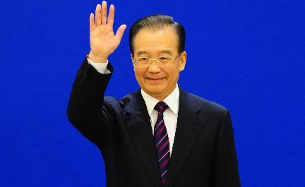 溫家寶總理向中外記者揮手致意