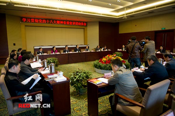 11月28日,黨的十八大精神湖南省委宣講團(tuán)正式成立,12月5日起至2013年元月底,宣講團(tuán)將赴長(zhǎng)沙、各市州、省直單位、高等院校和大型企業(yè)開講,并將在紅網(wǎng)等網(wǎng)站開展網(wǎng)上視頻宣講。湖南省委常委、省委宣傳部部長(zhǎng)許又聲出席動(dòng)員會(huì)并講話。