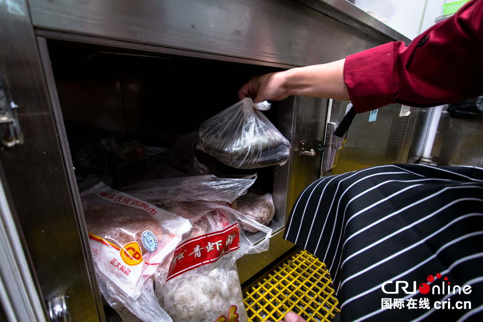 隨旅客一起啟程的還有幾十斤蔬菜、蒸好的兩屜米飯、幾條活魚和一些鮮蝦。在這14個(gè)小時(shí)的旅途中,廚師長(zhǎng)白振慶和他的老搭檔將用這些食材,在只有幾平米的廚房?jī)?nèi)盡可能烹調(diào)出可口的菜肴。圖為白振慶師傅檢查備品情況。
