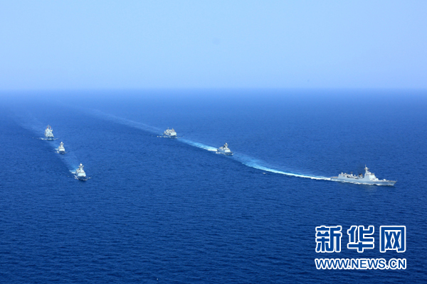 圓滿完成亞丁灣、索馬里海域護(hù)航任務(wù)的中國海軍第二十批護(hù)航編隊(右)與第二十一批護(hù)航編隊分航,駛離亞丁灣海域開始執(zhí)行環(huán)球訪問任務(wù)(2015年8月23日攝)。新華社發(fā)(曾濤 攝)